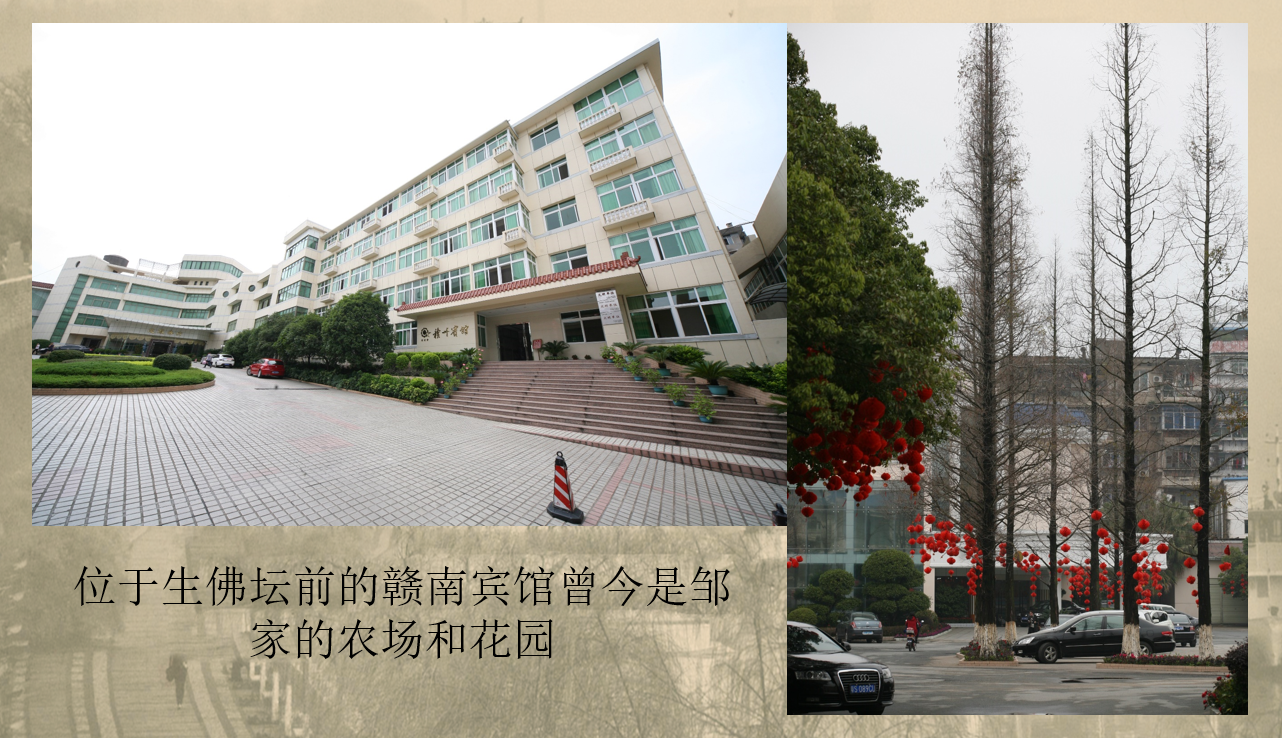 说到生佛坛前就不得不提到邹老汇。邹老汇是谁呢,他是旧时赣州四大家族之一的邹氏家族、邹家的富豪,老些岁数的人尽所皆知。中山路现在的幼儿园是原来邹家的立生粮行;中山路与解放路接壤处是邹家的同聚钱庄;稻香村的位置是邹家的大染房;航运局位置是邹家糕饼作坊;在赣县挑园一带的粮田,几乎全部是邹家所有;赣南宾馆曾经是邹家的农场和花园,里面种养着猪、鱼、莲藕、水稻,四季有鲜花鲜果。